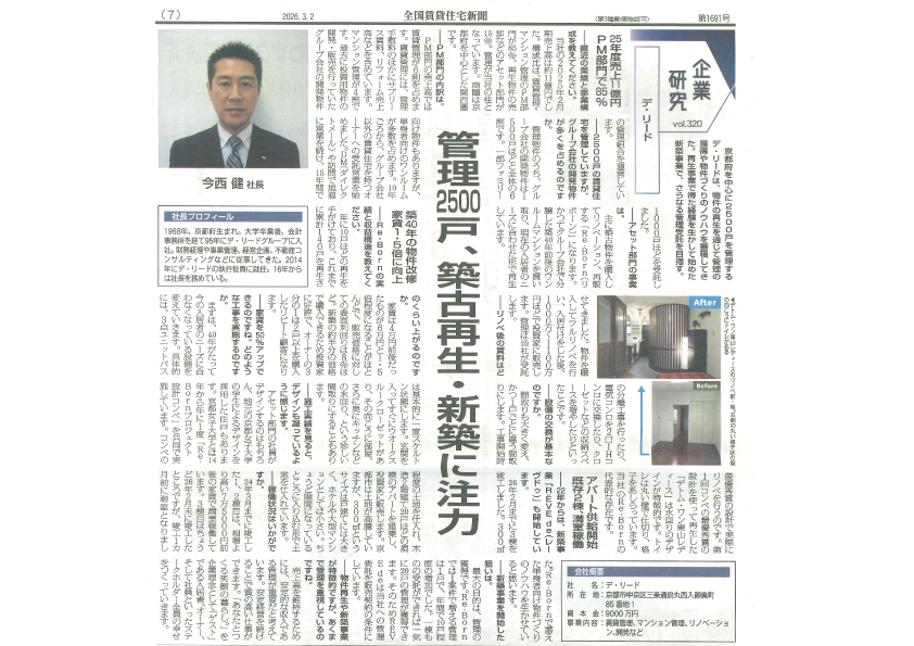 『全国賃貸住宅新聞2026年3月2日NO.1691』にて弊社の事業が掲載されました