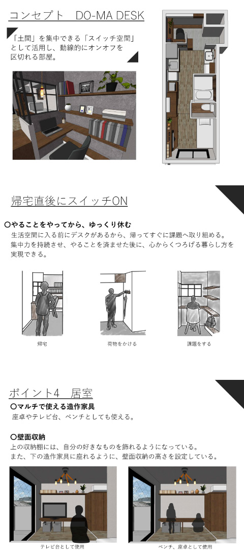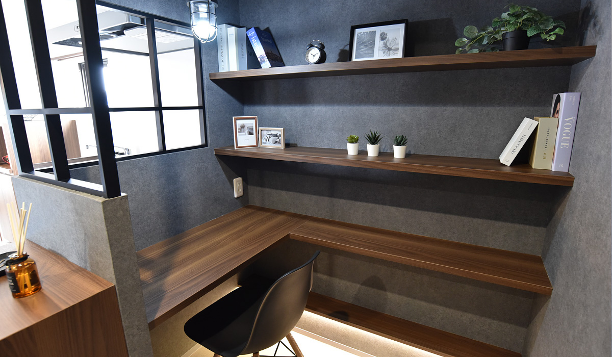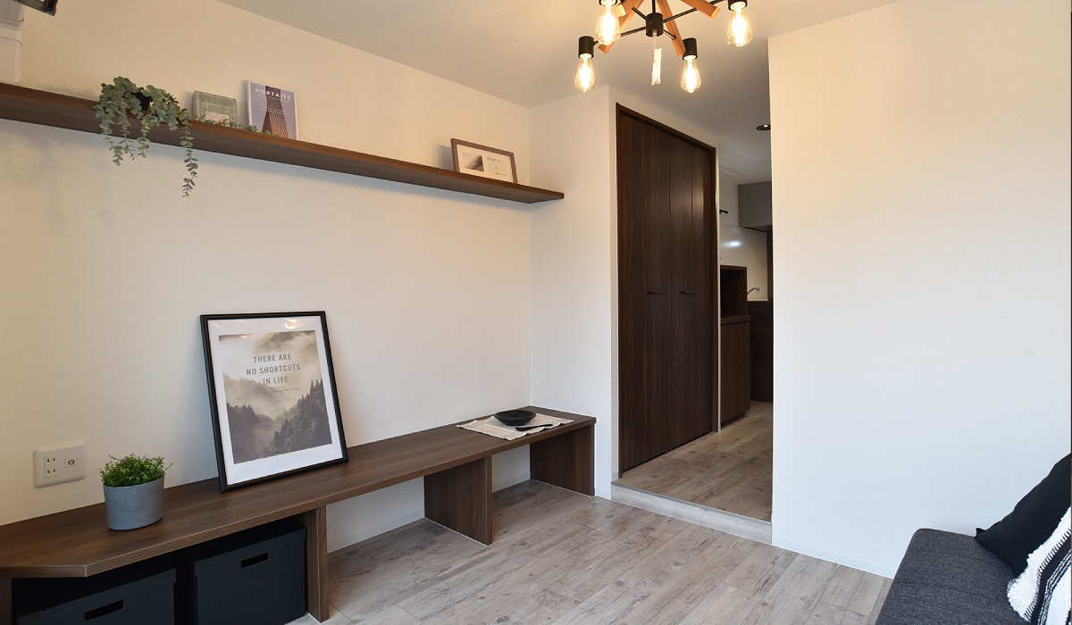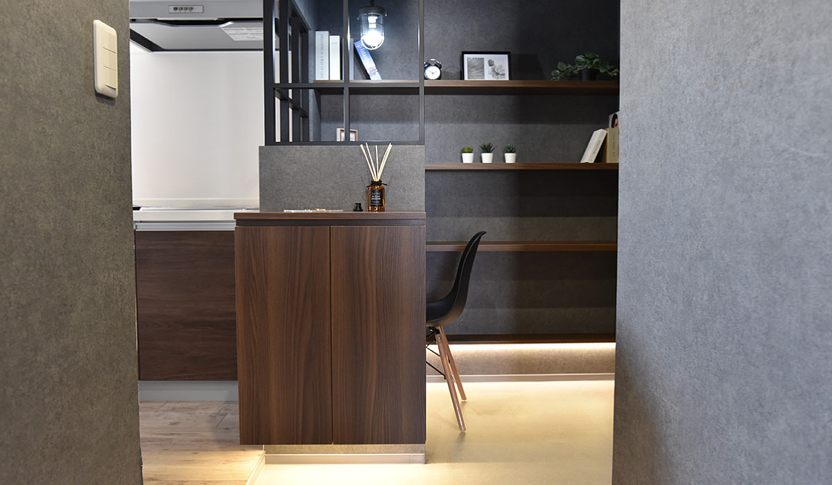 生活のOn ・Offを土間でワークスペースとプライベートスペースに分けた、時代の流れに沿った、住まう人のライフスタイルを考慮した斬新な発想が評価されました。足元の間接照明は、玄関からの出迎え、特別感を演出した空間が広がり、また仕事や勉強に適した落ち着きのある雰囲気に仕上がっています。