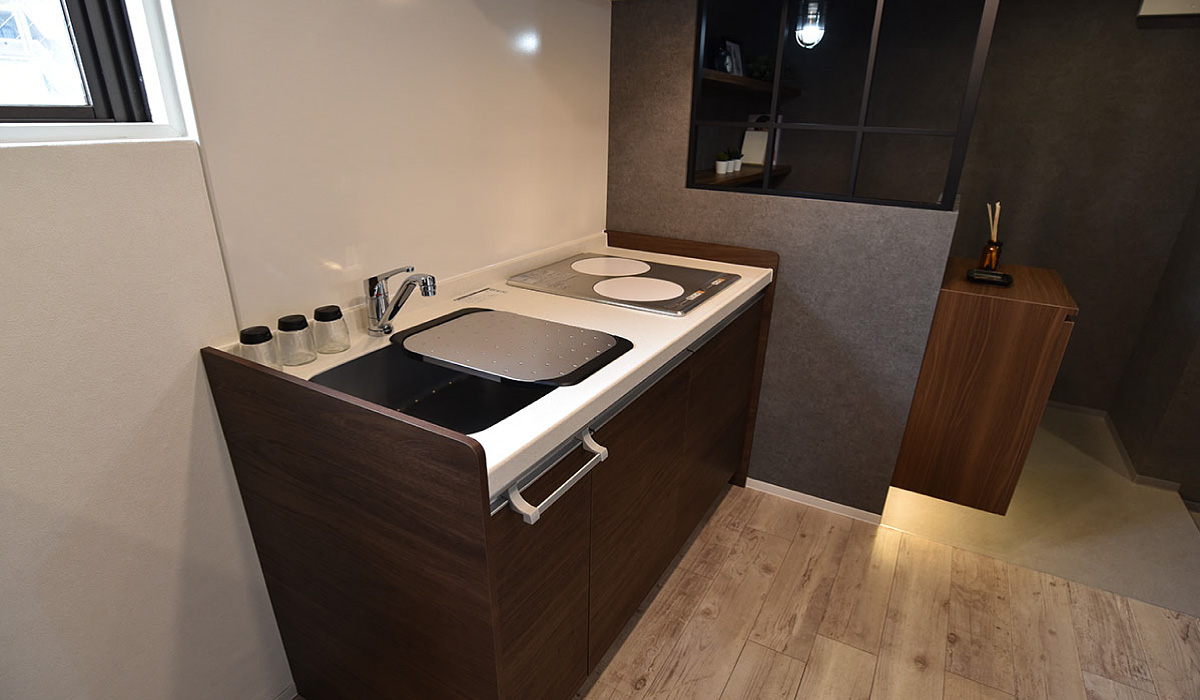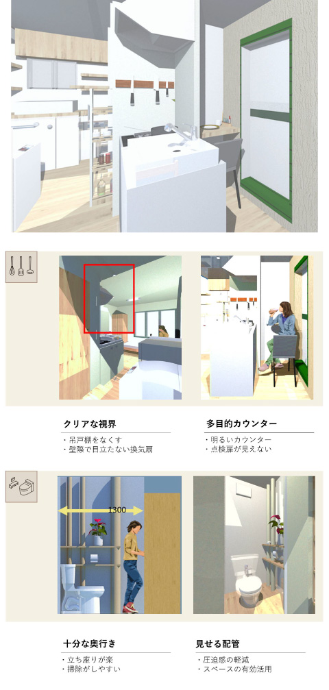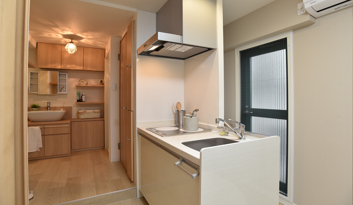 配管を隠さず活かすことで周囲にゆとりをもたらし、バルコニーからの光を取り入れた開放的なキッチンに、居室全体に自然光が届く明るい住まいを目指しました。