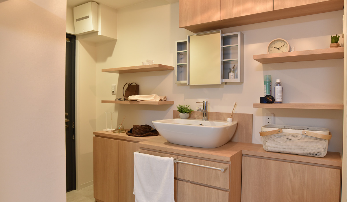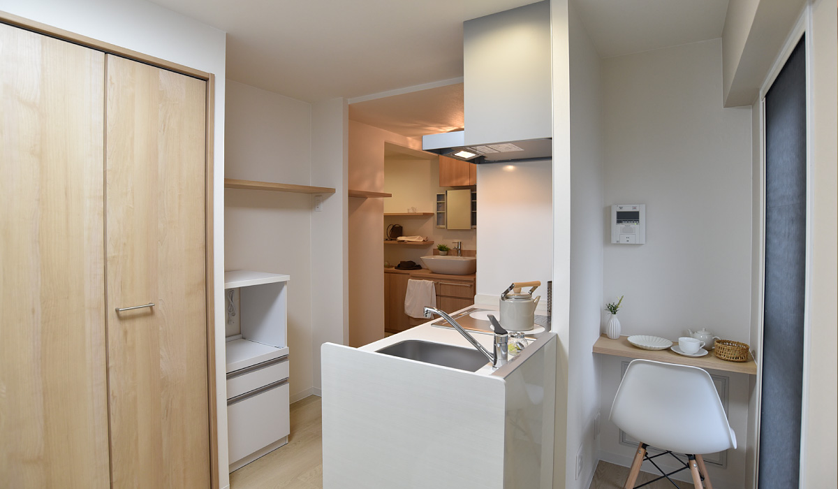 トイレの配管をオープンにするという発想、キッチンをアイランド型として、バルコニーまでの導線の確保したプランが評価されました。玄関から続く下駄箱、洗面、収納スペースと、木目のあたたかさとともに、住む人を包み込んでくれるようなナチュラルな空間がレディースマンションらしい仕上がりとなっています。