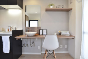 グレージュアッシュの建具とカウンターが心地よい洗練されたお部屋です。ワンポイントにブラックの小物やソファを取り入れて、落ち着いた大人の雰囲気をコーディネートすることができます。通路部分には、飾り棚としてのニッチや、調味料を保管するスタイリッシュパントリー等、空間を有効利用し利便性を追求したRe-Bornをお楽しみいただけます。