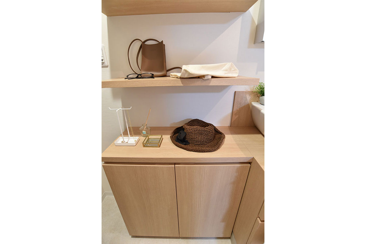 帰宅時の導線を考慮したエントランス洗面カウンターは、コスメ、洗剤、衣類等あらゆるものを収納できるオリジナルカウンターです。