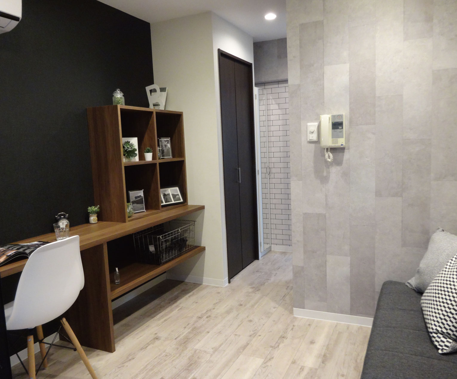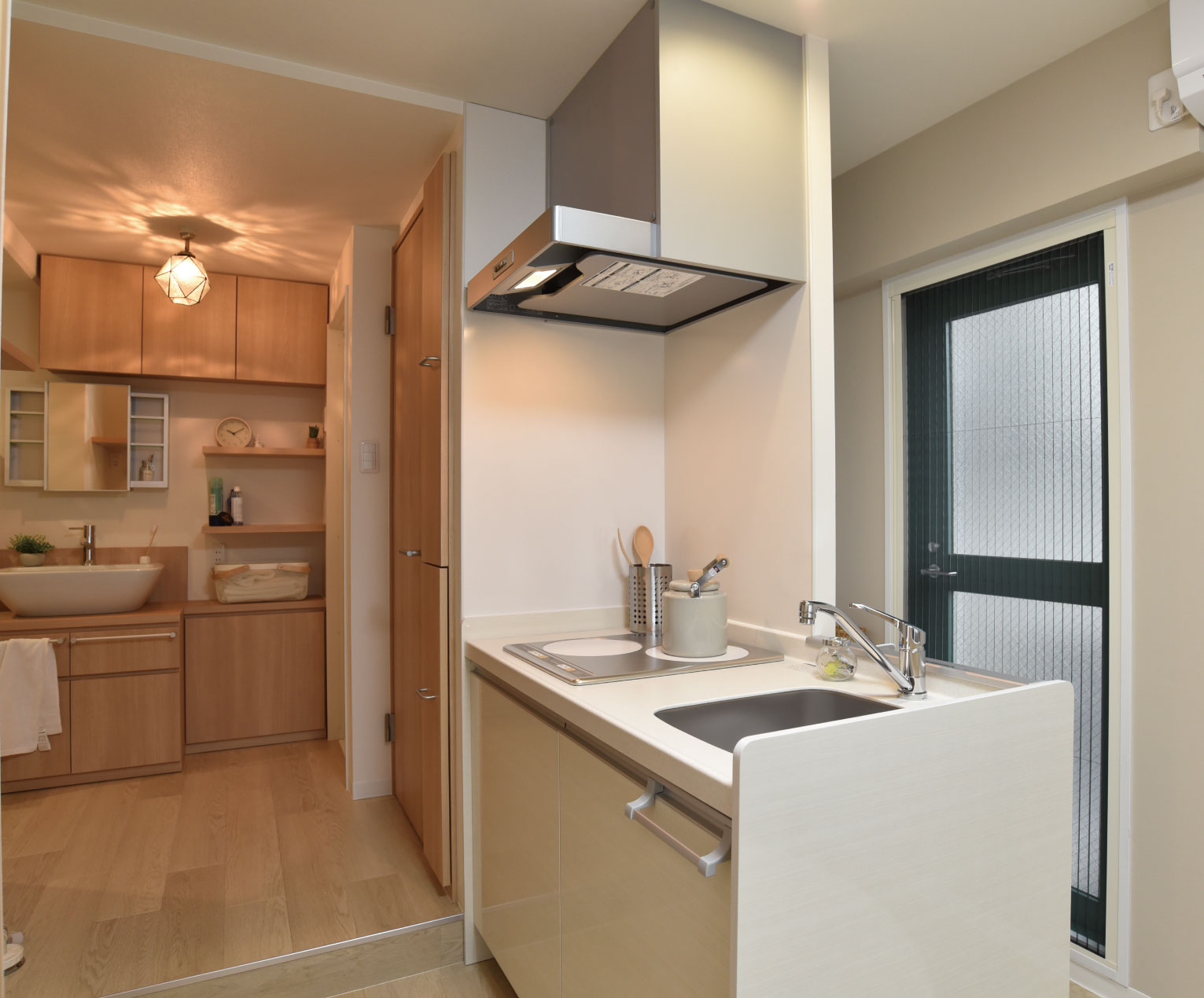 小路を抜けると、隠れ家カフェのように現れるプライベートルーム。統一された色調にウッドが取り入れられ、穏やかな時間を刻みます。
